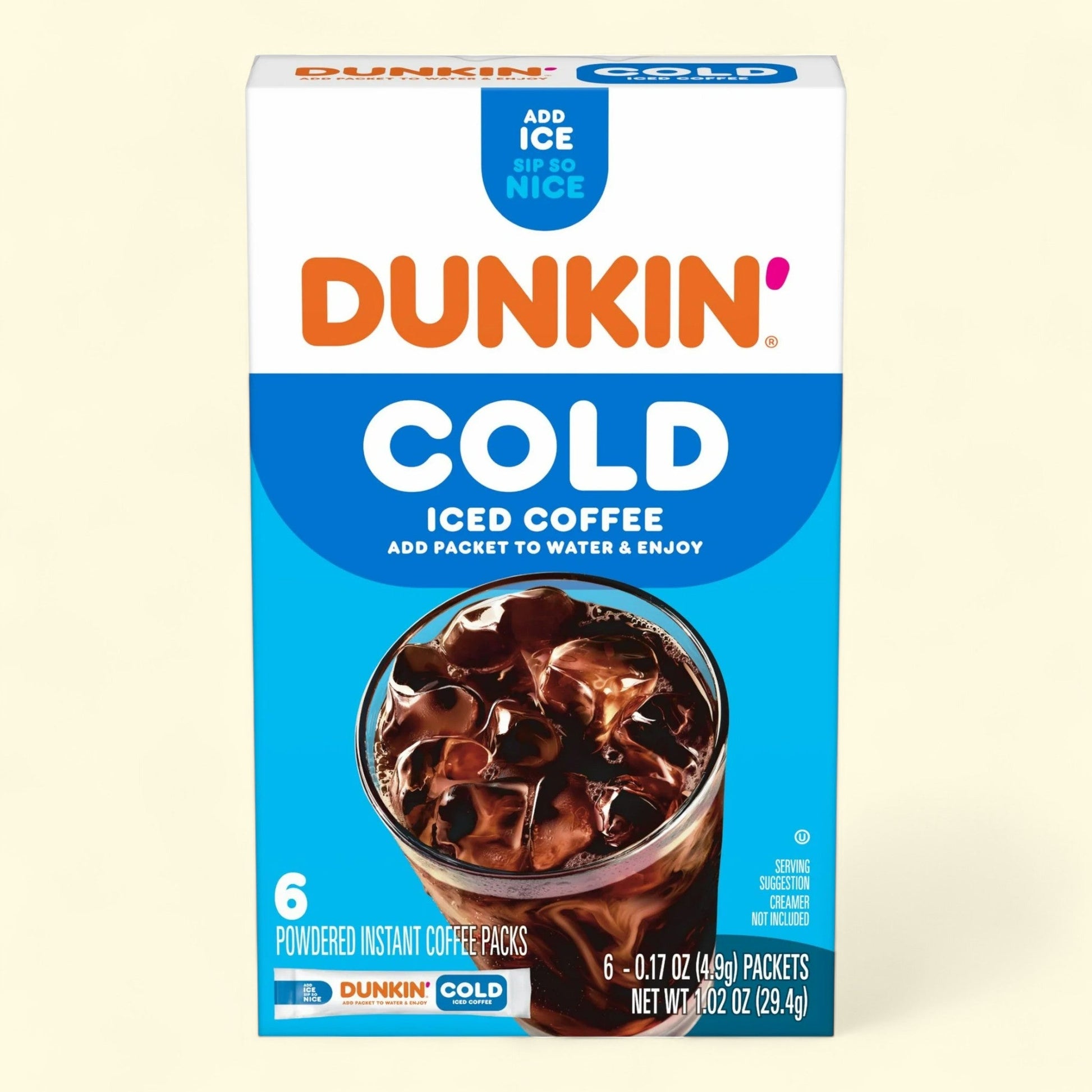Elevate your at-home coffee experience with Dunkin' Cold Iced Coffee Powdered Instant Coffee Packs. Indulge in the smooth and bold taste of Dunkin' coffee anytime you crave it, without having to make a trip to the cafe. These convenient packets are easy to make - simply add them to cold water or milk for a refreshing and satisfying drink. Crafted specifically for cold coffee, these packs stand up to ice, ensuring that your beverage stays deliciously chilled. Enjoy the unmistakable Dunkin' flavor in the comfort of your own home with these ready-to-make instant coffee packs. Treat yourself to a taste of Dunkin' Iced Coffee today!