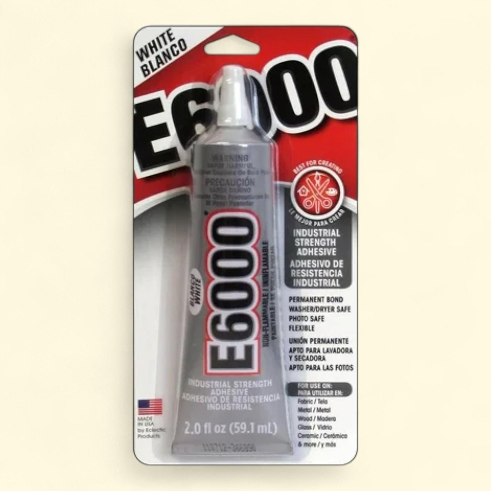 Introducing the Eclectic E6000 Adhesive Glue, a reliable choice for all your bonding needs. This industrial strength adhesive in a white hue provides extreme durability, forming a tough and permanent bond that can withstand even the most demanding tasks. Its flexibility ensures a secure hold without cracking, yellowing, or becoming brittle under stress, making it perfect for a variety of applications. Whether you're working on DIY projects, crafts, repairs, or more, this 2 fl. oz. size is convenient and easy to use. Trust in the Eclectic E6000 Adhesive Glue for a dependable solution to your sticking needs.