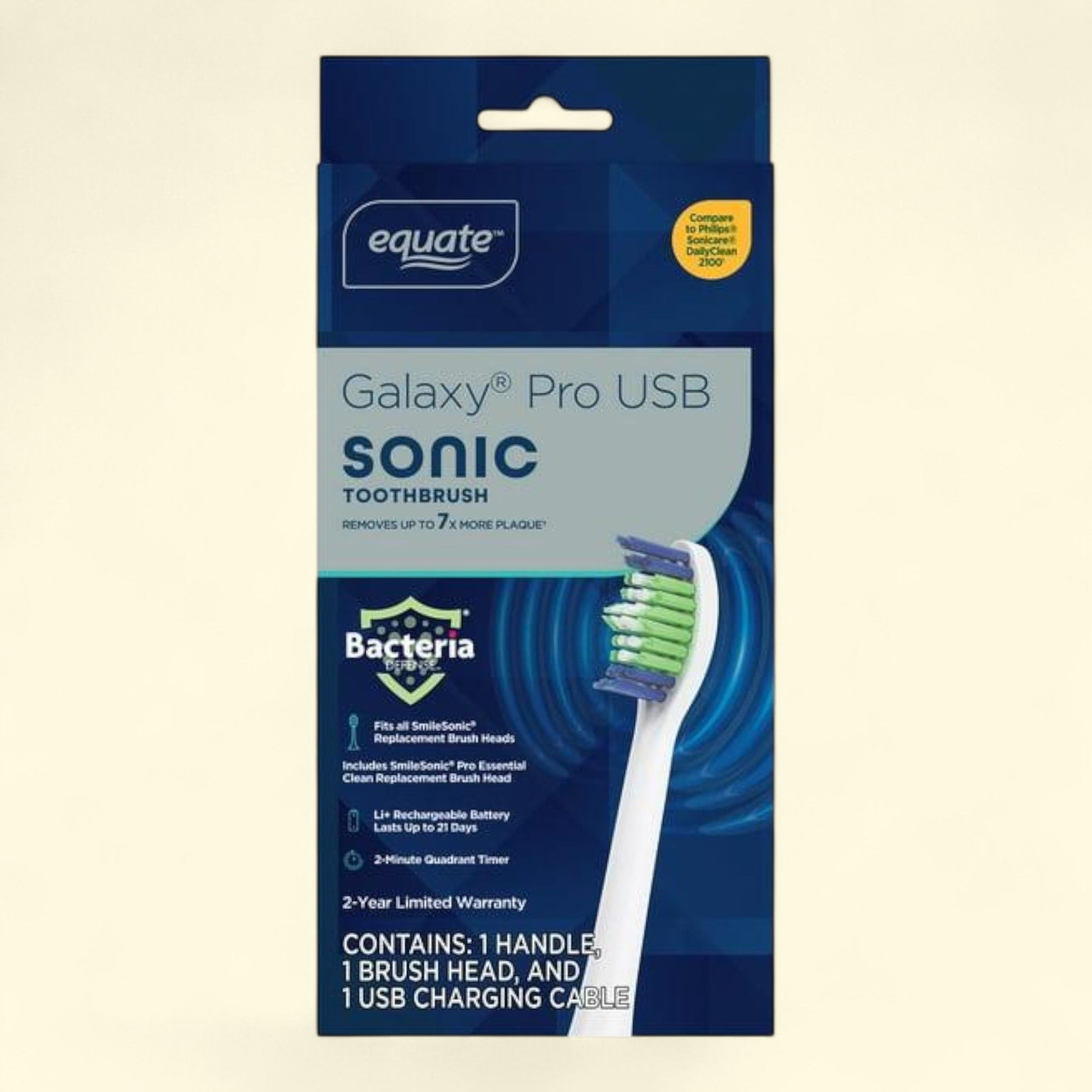 Equate Galaxy Pro USB Sonic Rechargeable Electric Toothbrush, White, 1 Handle, 1 Brush Head, 1 USB Charging Case, Compare to Philips Sonicare Daily Clean 2100