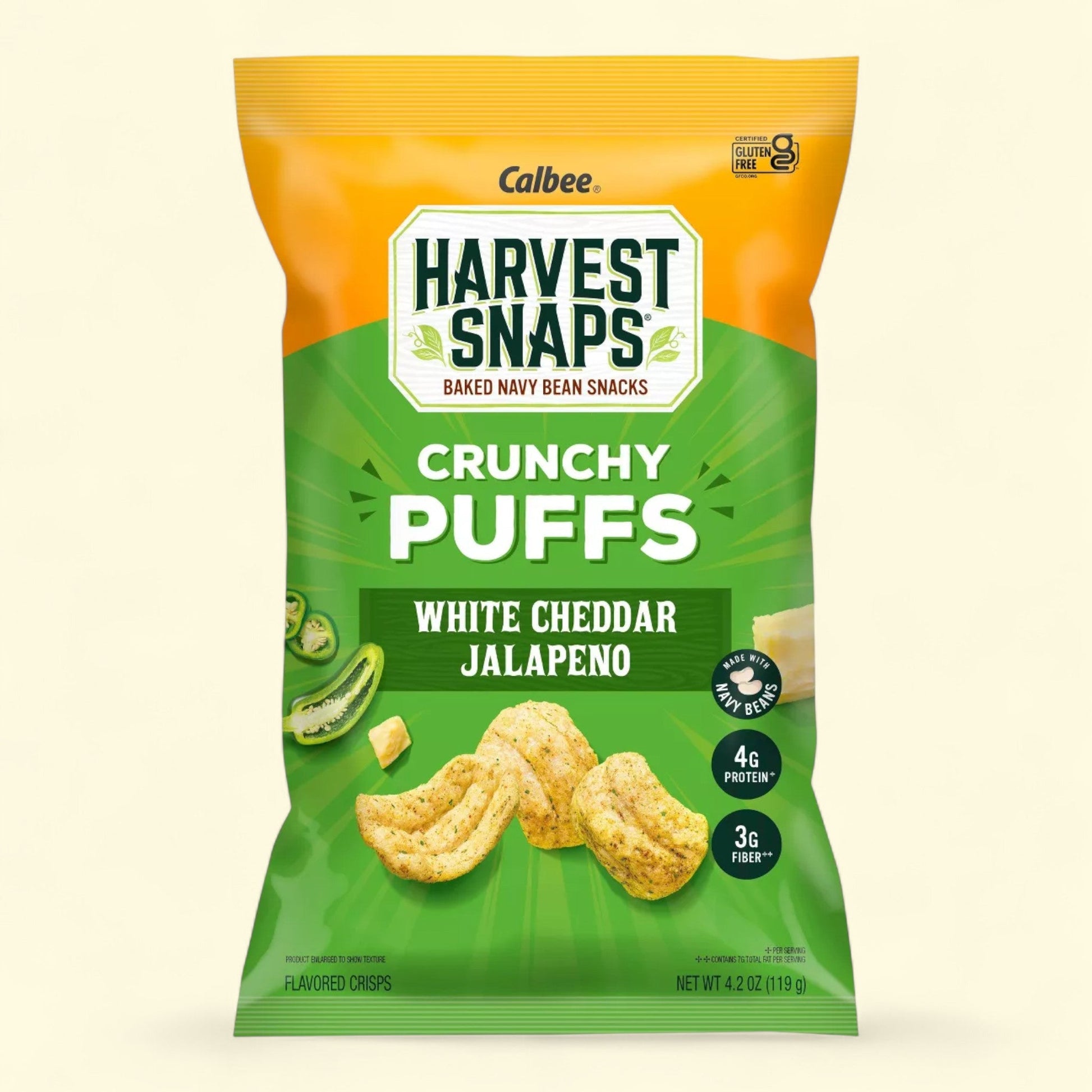 Experience a deliciously crunchy snack with Harvest Snaps White Cheddar Jalapeno Crunchy Puffs. These baked puffs are not only gluten free, but also packed with plant protein, making them a guilt-free treat for any time of day. With no artificial flavors or preservatives, you can enjoy the satisfying taste of white cheddar and jalapeno without any added chemicals. Perfect for on-the-go snacking or as a flavorful addition to your lunch, these puffs are sure to satisfy your cravings while providing a wholesome snack option. Indulge in the bold flavors and satisfying crunch of Harvest Snaps White Cheddar Jalapeno Crunchy Puffs today.