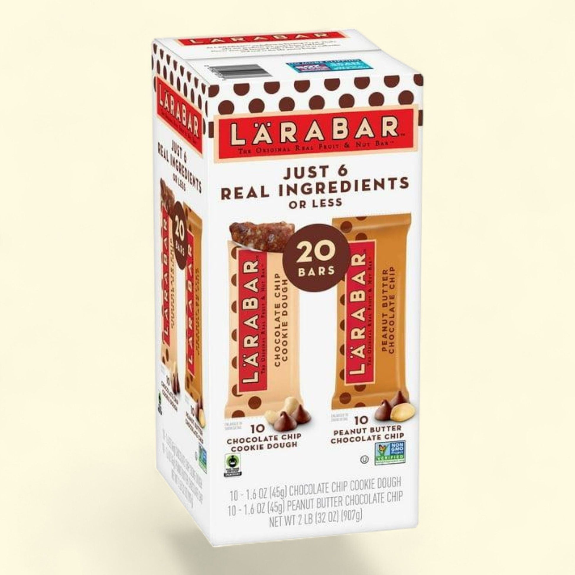 Indulge in the delicious simplicity of Larabar Bars with this Variety Pack. Each pack includes a total of twenty 1.6 ounce bars, with a perfect mix of 10 Chocolate Chip Cookie Dough and 10 Peanut Butter bars. Made with just four wholesome ingredients, these vegan and gluten-free bars are perfect for those who appreciate the finer things in life. Whether you're looking for a quick snack on-the-go or a guilt-free treat, these bars are sure to satisfy your cravings. With a focus on quality ingredients and great taste, Larabar Bars are a must-have for anyone looking to feel good about their snacking choices.