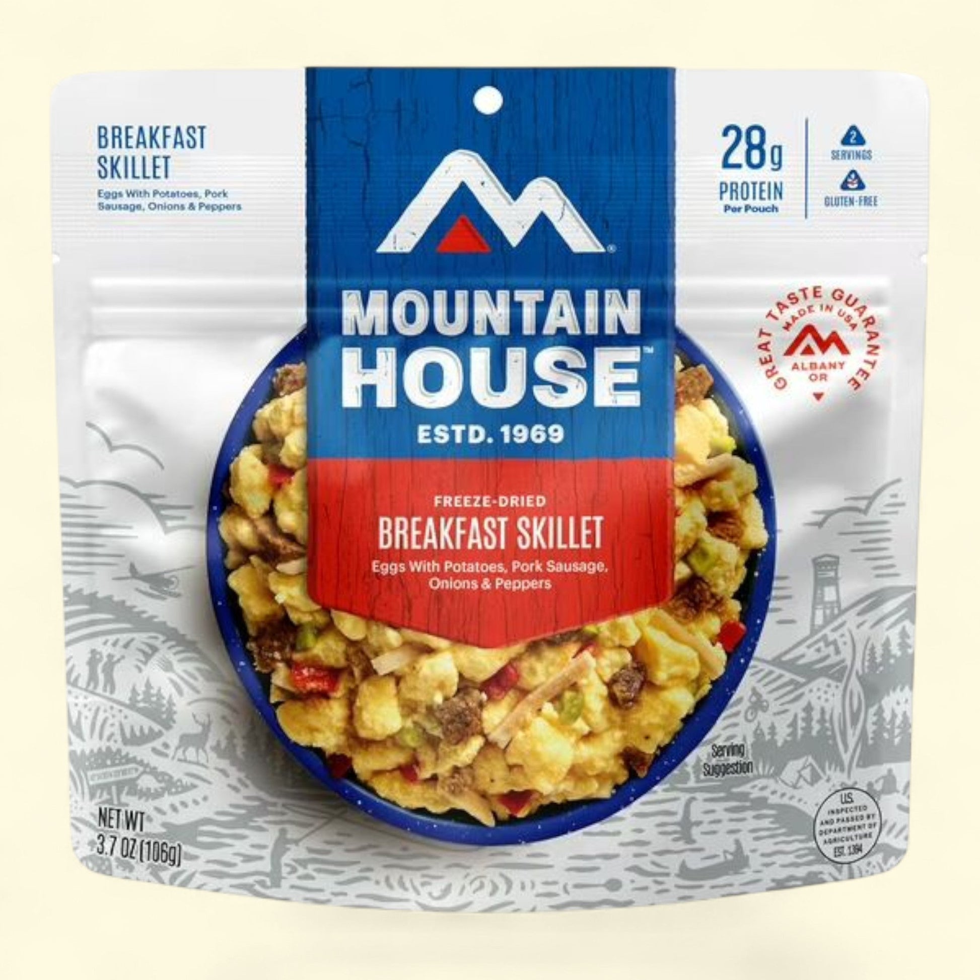 Introducing the Mountain House Breakfast Skillet, a convenient and delicious option for your outdoor adventures or quick meals at home. This freeze-dried camping and backpacking food is packed with hash browns, scrambled eggs, crumbled pork patty, peppers, and onions for a hearty and satisfying breakfast experience. With a quick 10-minute preparation time using just hot water, this gluten-free skillet is perfect for those on the go. Made with no artificial flavors or colors, this lightweight and portable pouch contains two servings, making it ideal for sharing or enjoying solo. Whether you're camping, backpacking, or simply looking for a tasty meal option, the Mountain House Breakfast Skillet is a versatile choice that's both flavorful and easy to prepare.