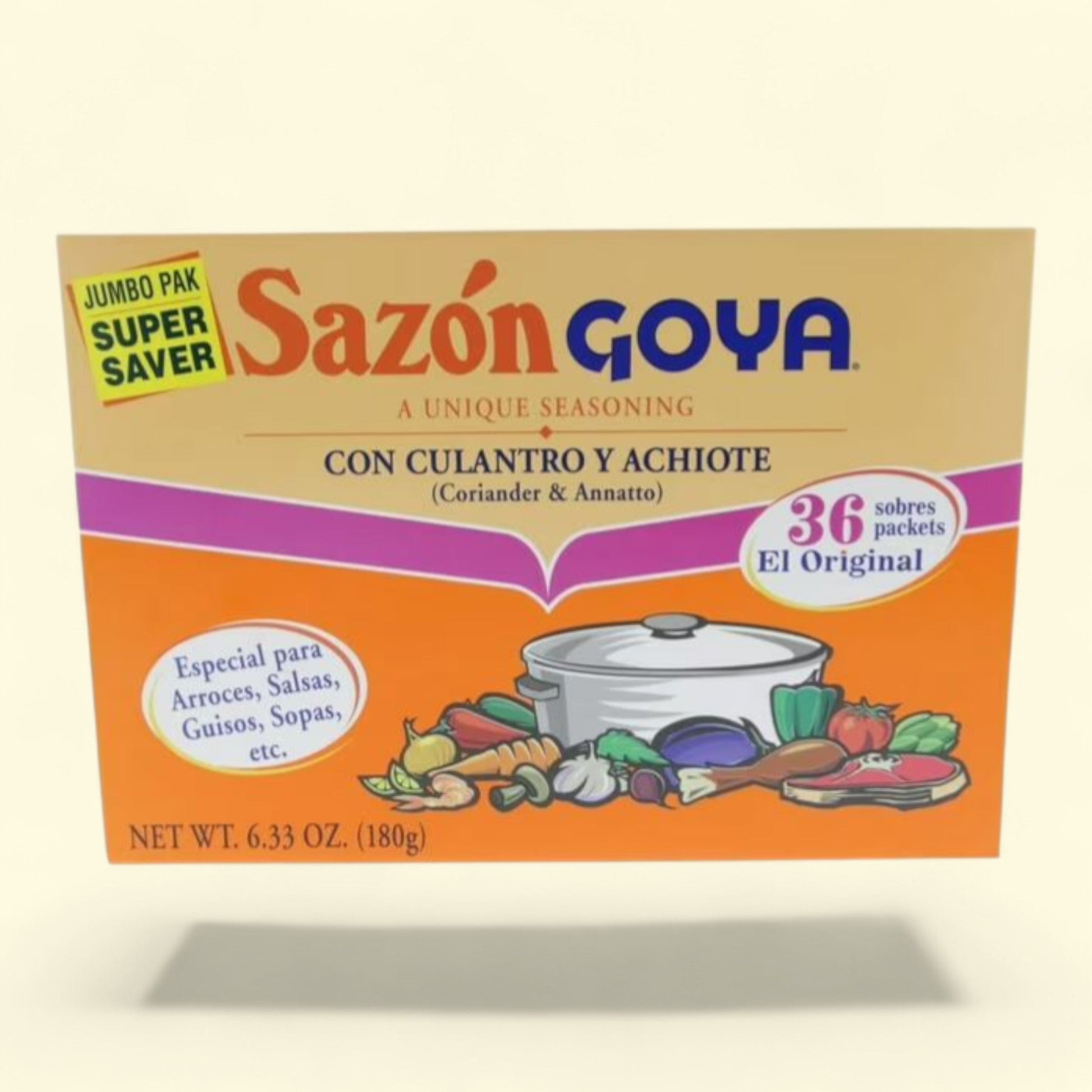 Enhance the flavor of your favorite dishes with Goya Sazon, Coriander and Annatto seasoning. This unique blend of coriander, garlic, cumin, and annatto spices provides a vibrant color and delicious taste that will elevate your meals to the next level. Perfect for meats, pasta, beans, rice, and soups, this seasoning is a versatile addition to any pantry. With 36 convenient packets in a jumbo pack, you'll have plenty of Goya Sazon on hand for all your cooking needs. Add a burst of flavor to your dishes and make every meal memorable with Goya Sazon, Coriander and Annatto seasoning.