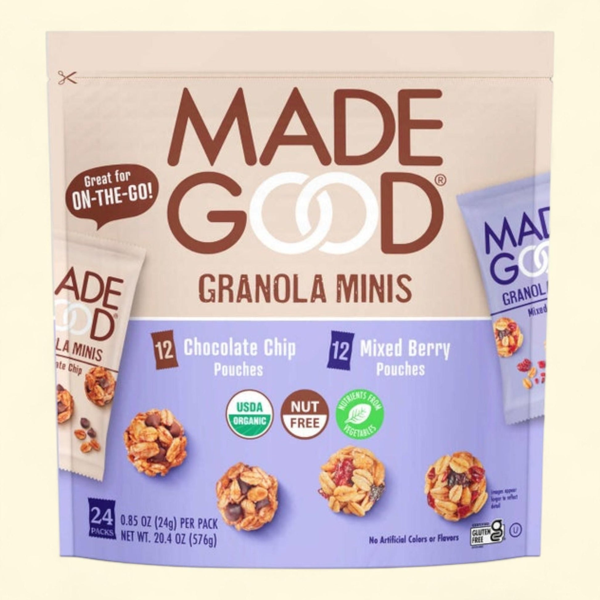 Discover the perfect on-the-go snack with MadeGood Granola Minis Variety Pack. This pack includes a delicious assortment of 12 Chocolate Chip and 12 Mixed Berry mini pouches, each weighing 0.85 oz. These Kosher-certified snacks are ideal for those looking for a convenient and tasty treat that is also allergen-friendly. Whether you're heading to work, school, or the gym, these Granola Minis are a satisfying option to keep you fueled throughout the day. With the perfect balance of sweetness and crunch, these mini pouches are sure to become a favorite snack option for the whole family.