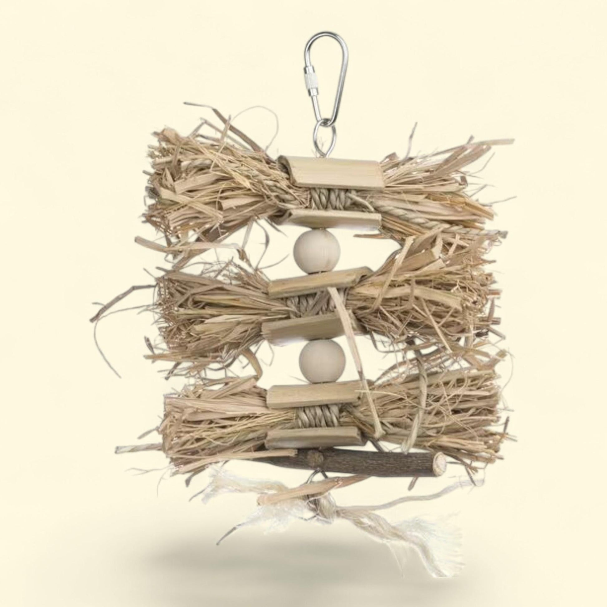 Introducing the Prevue Pet Products Woodland Harvest Bird Toy, a must-have accessory for your feathered friend's cage. This unique toy not only promotes exercise but also encourages nest-building activity, keeping your bird mentally stimulated and physically engaged. Made from a combination of bamboo and natural grass, this toy is both fun and safe for your pet to deconstruct. The straw grass bundles are wrapped with natural sea grass rope, providing endless entertainment for your bird. Crafted with bird-safe materials including a quick-link, stainless steel wire, sea grass rope, wood, beads, and bamboo, this toy is sure to be a favorite in your bird's playtime routine. With approximate dimensions of 8" H x 5 3/4â?? L x 1â?? W, this toy is the perfect size for most bird cages. Treat your feathered friend to the Prevue Pet Products Woodland Harvest Bird Toy today!