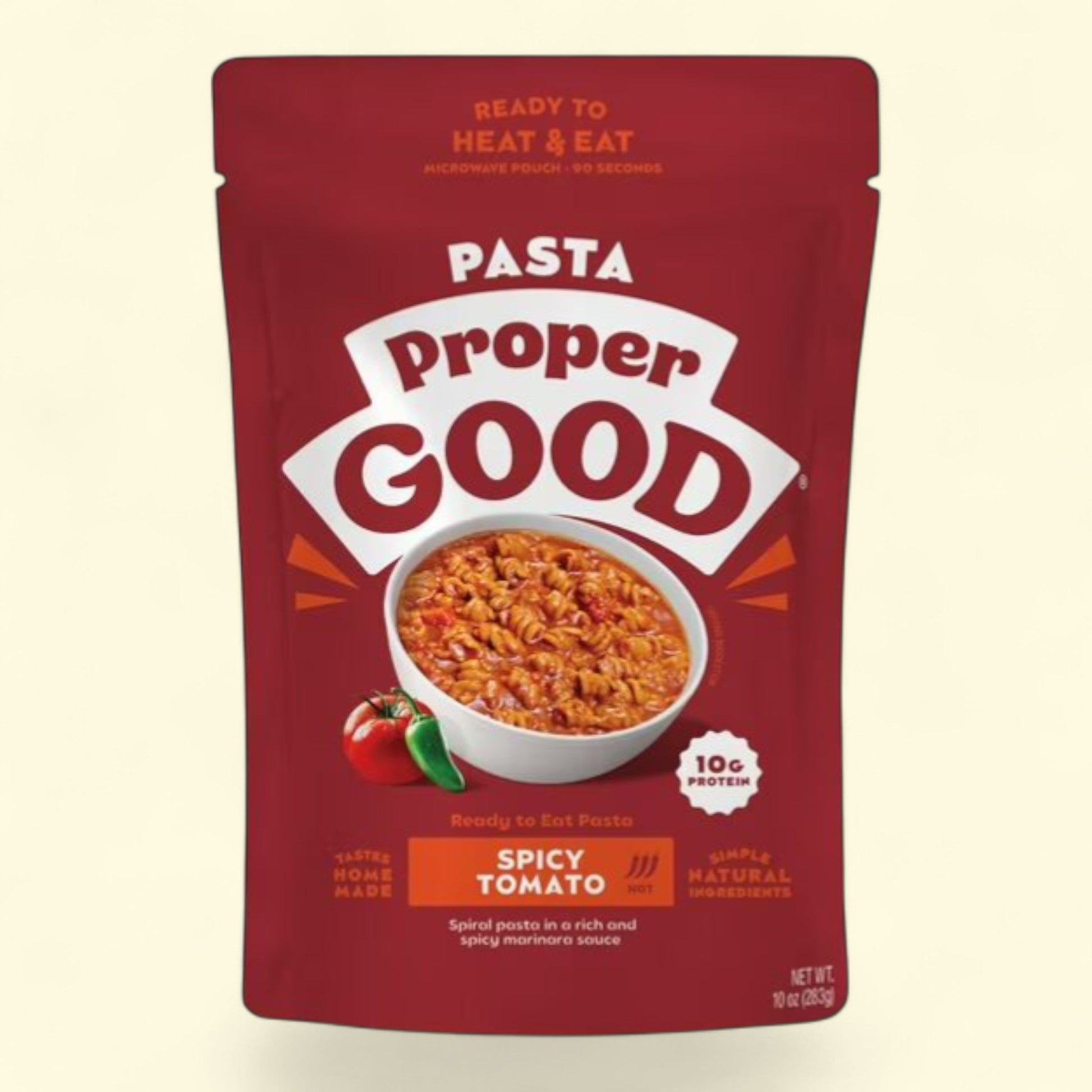 Introducing Proper Good's Spicy Tomato Pasta, a rich and satisfying meal ready in just 90 seconds. Made with spiral pasta and a spicy marinara sauce, this shelf-stable meal is perfect for those looking for a quick and delicious option on-the-go. With 10g of protein and no added sugar, this meal is not only convenient but also packed with wholesome ingredients. Whether you're at work, running errands, or traveling, this Shark Tank favorite is a must-have for those craving a homemade taste without the hassle of cooking. Say goodbye to frozen meals and hello to a real, flavorful dining experience with Proper Good's Spicy Tomato Pasta.